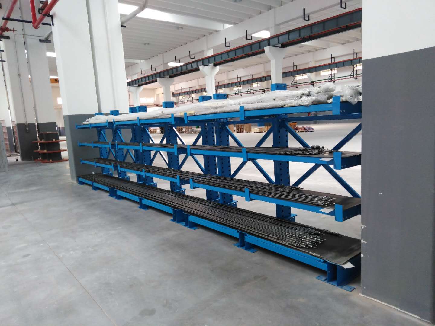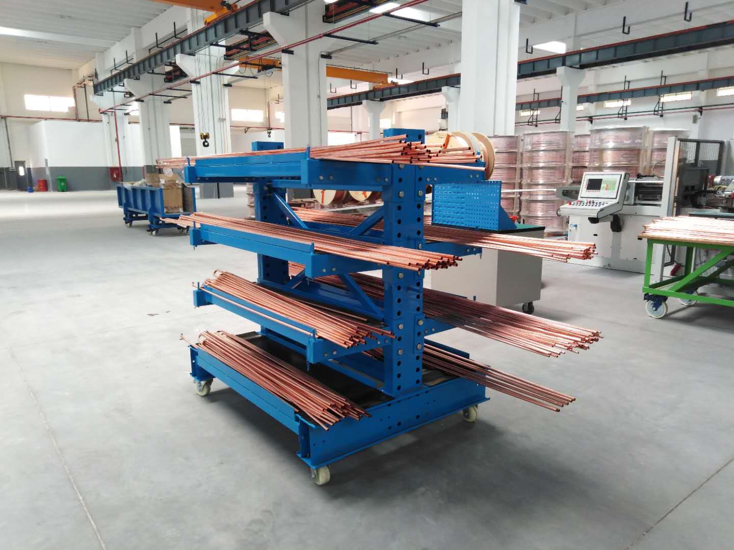 換熱器生產(chǎn)車間,存放鋁管及銅管,原料要求不能變形,設(shè)計(jì)非標(biāo)懸臂貨架,鋪設(shè)層板,上面放置膠皮,保證原料不變形,而且有膠皮不會磨損。懸臂貨架下面安裝腳輪,便于車間周轉(zhuǎn)。